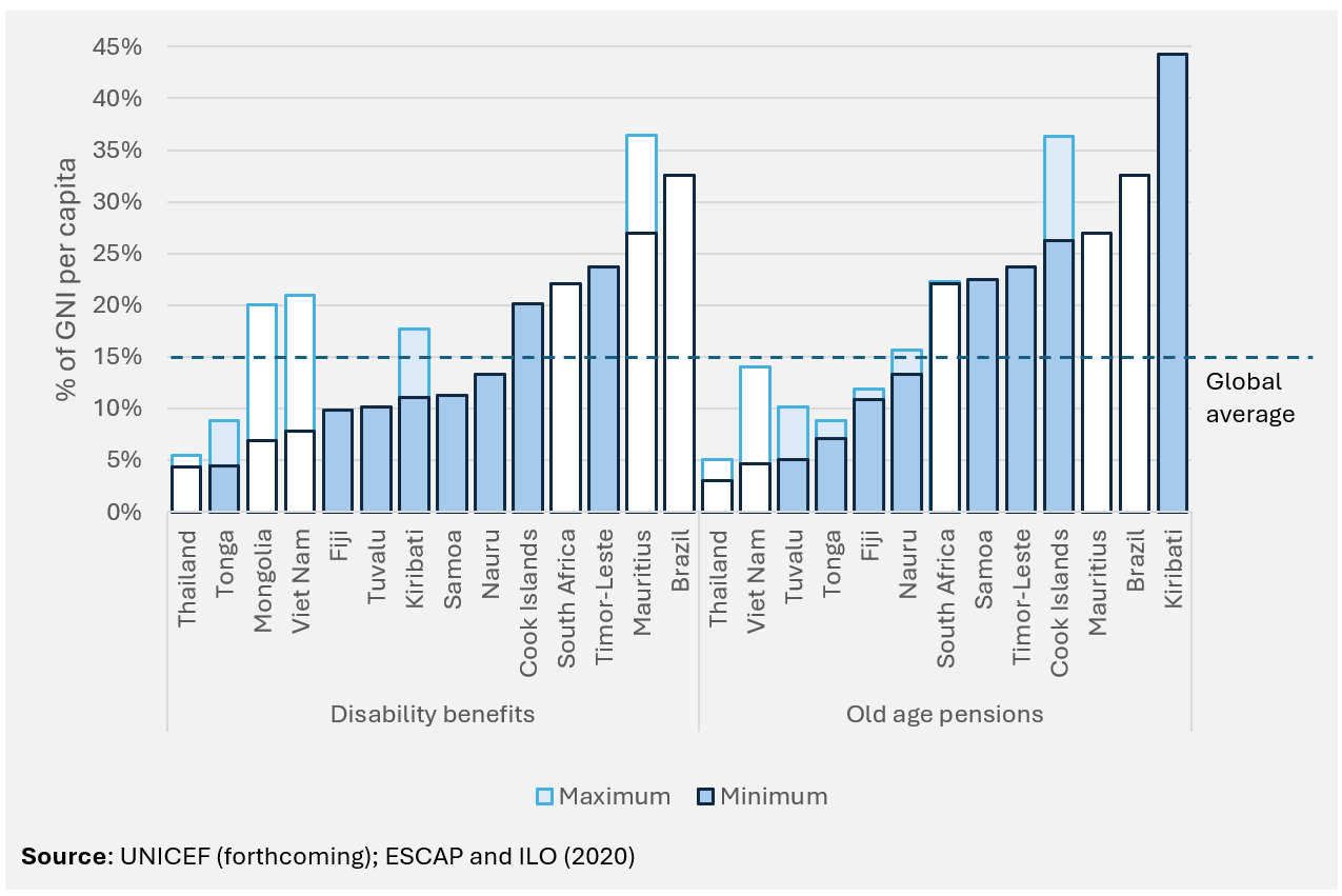 To understand how social protection meet people’s needs, known as adequacy, the study measured benefits relative to gross national income (GNI) per capita. This shows how Pacific island countries (PICs) compare globally. Focusing on the two most common schemes in the Pacific—old age and disability benefits—gives a mixed picture (Figure 1).