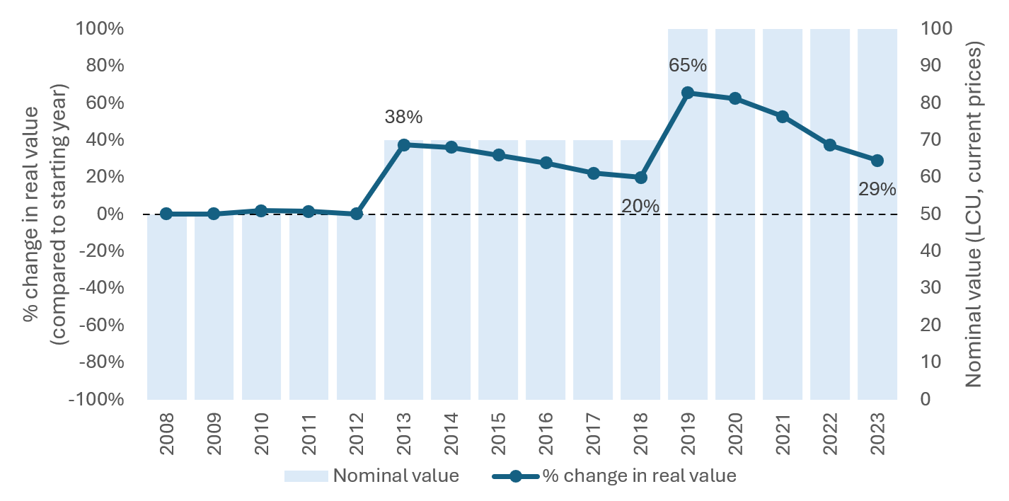 Tuvalu’s old age and disability benefits shows the consequence of this approach. While the benefit level has been increased twice since the Senior Citizen Scheme’s introduction, the real value has been eroded each time by inflation in subsequent years (Figure 2). While the purchasing power in 2023 was 29 per cent higher than when the scheme was introduced, this was well below the value in 2019 when the benefit was last increased (65 per cent higher than at introduction). The pattern is even more extreme in other countries, with Timor-Leste’s old age and disability benefit having fallen by 40 per cent in real terms between 2008 and 2022 (before an increase in 2023).