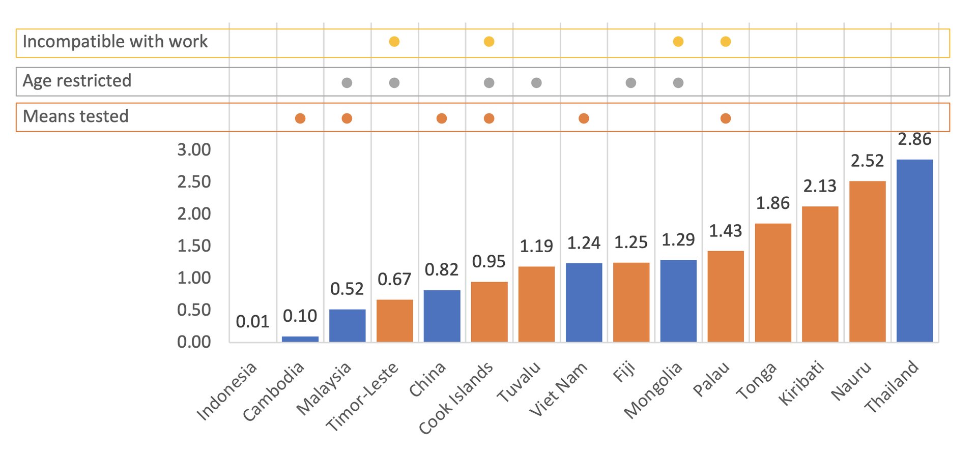 Figure 2: Recipients of disability benefits as a share of total population (%), compared to key design features, East Asia and Pacific countries